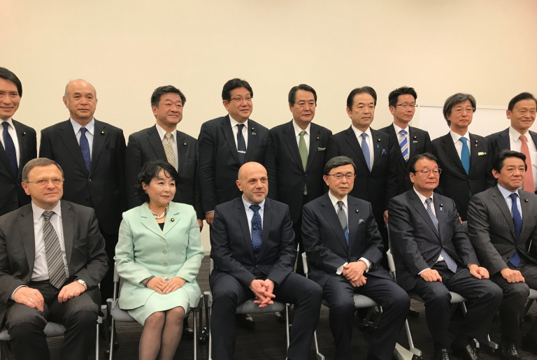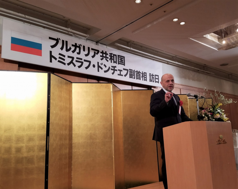 Заместник министър-председателят Томислав Дончев проведе работни срещи с министъра на икономическата ревитализация на Япония Тошимицу Мотеги и с представители на двете камари на японския парламент. Тема на срещите са перспективите пред българо-японските търговско-икономически отношения, както и инвестициите в региона и в Европа в контекста обсъждането на Споразумението за свободна търговия между ЕС и Япония. Разговорите са част от работното посещение на вицепремиера в Токио и Осака в продължение на срещата на министър-председателя Борисов и японския премиер Шиндзо Абе в София в началото тази година. Дончев подчерта, че в продължение на договореностите между двамата премиери предстои да бъде разработен план с конкретни стъпки за насърчаване на двустранните икономически отношения. По думите му основните перспективи за японски инвестиции в България са в секторите автомобилостроене, електроника, фармация, енергетика, високи технологии и иновациите, научноизследователска дейност, участие в регионалните индустриални зони.
