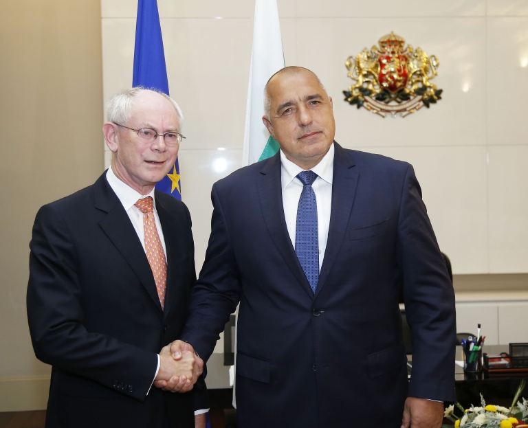 Борисов прие сърдечните поздравления на Херман ван Ромпой за третия му премиерски мандат, след което запозна своя гост с основните приоритети, върху които кабинетът ще работи през следващите четири години. Той обърна специално внимание на финансовата дисциплина на страната ни и на стремежа да се развива икономиката.